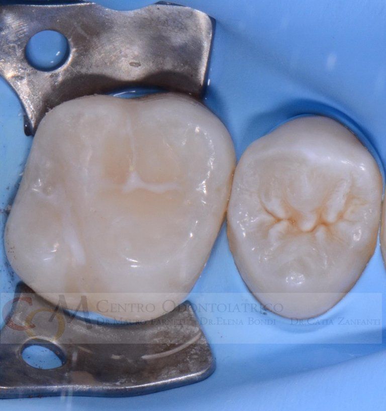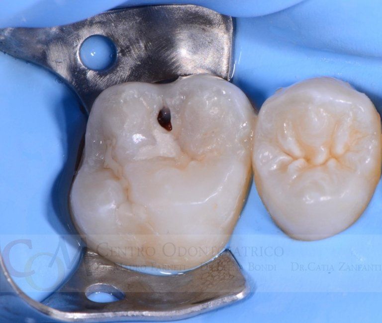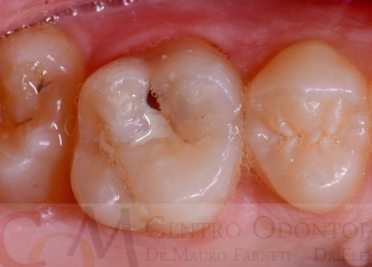 However, this practice is often carried out inconsiderately. Not all teeth need to be sealed: the morphology (i.e., shape) of the teeth, the caries susceptibility of the child, and oral hygiene at home need to be evaluated. If, based on these considerations, sealing is deemed necessary, it should be conducted according to a precise clinical protocol, which includes the application of a rubber dam (see topic in "Services"), cleaning of any pigmented grooves, and bonding of the sealant. "Forgetting" one of these steps results in poor-quality therapy: for example, sealing grooves without prior cleaning risks sealing decay underneath. Upon inspection by the dentist, these grooves would appear sealed... but so would the underlying decay, which wasn't removed, making it invisible. This would result in dental decay that cannot be diagnosed in its early stages as it is "covered" by the dental sealant... truly not a good job! Below are examples of correctly sealed and emblematic cases of how sealing should NOT be performed.