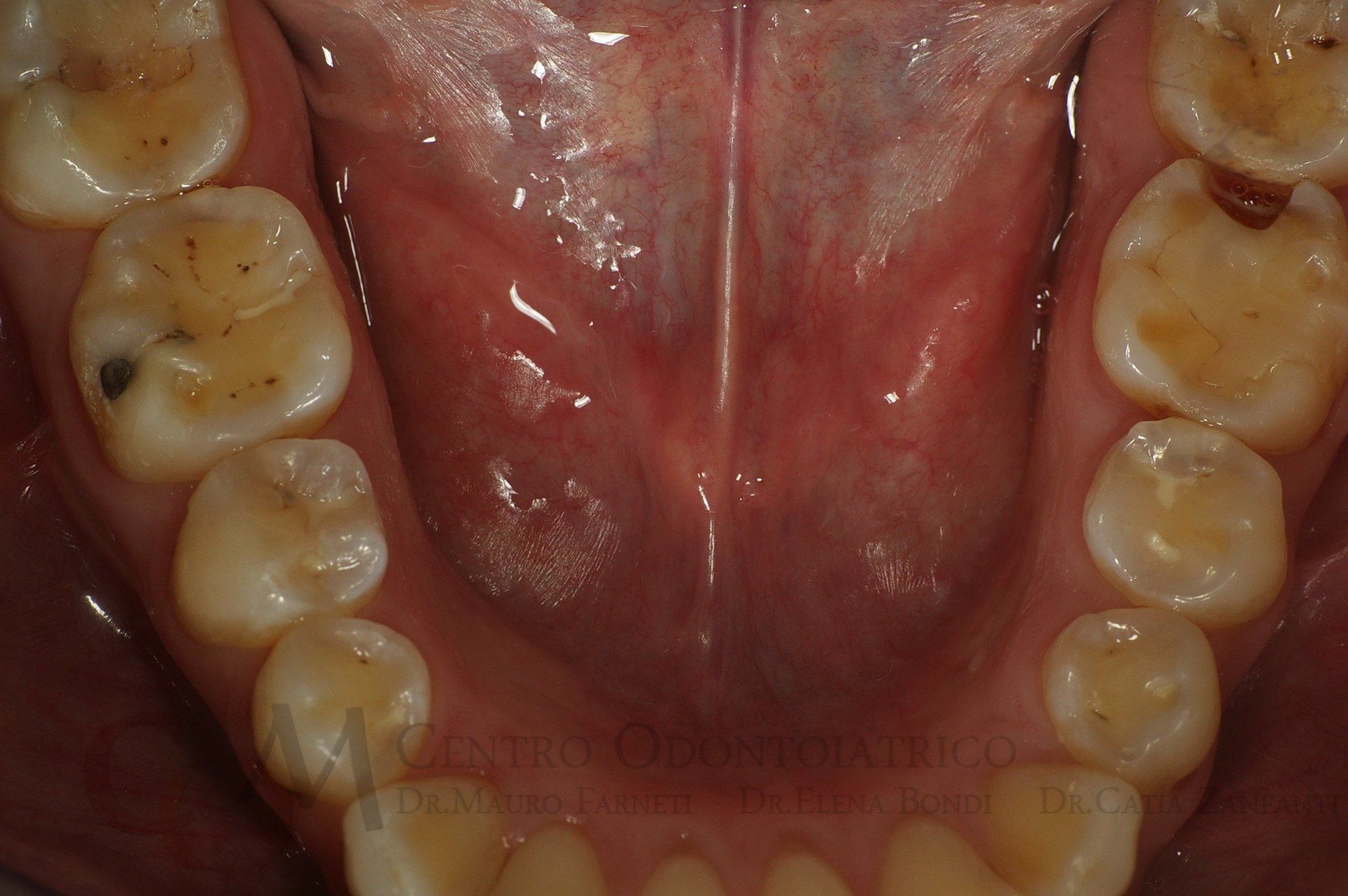 Ecco un caso sempre più frequente in questi anni 2000! Spesso i pazienti erodono le superifici dentali con un consumo spropositato dei cosidetti "soft drinks" (cole, the freddi, bevande isotoniche), che oltre ad essere cariogeni (ovvero a predisporre alla carie) determinano anche una erosione della matrice dello smalto. E quasi sempre questi pazienti sono giovani! Anche anoressia e bulimia provocano lesioni simili, ma inizialmente sono più colpiti i denti anteriori, nelle loro porzioni palatine.