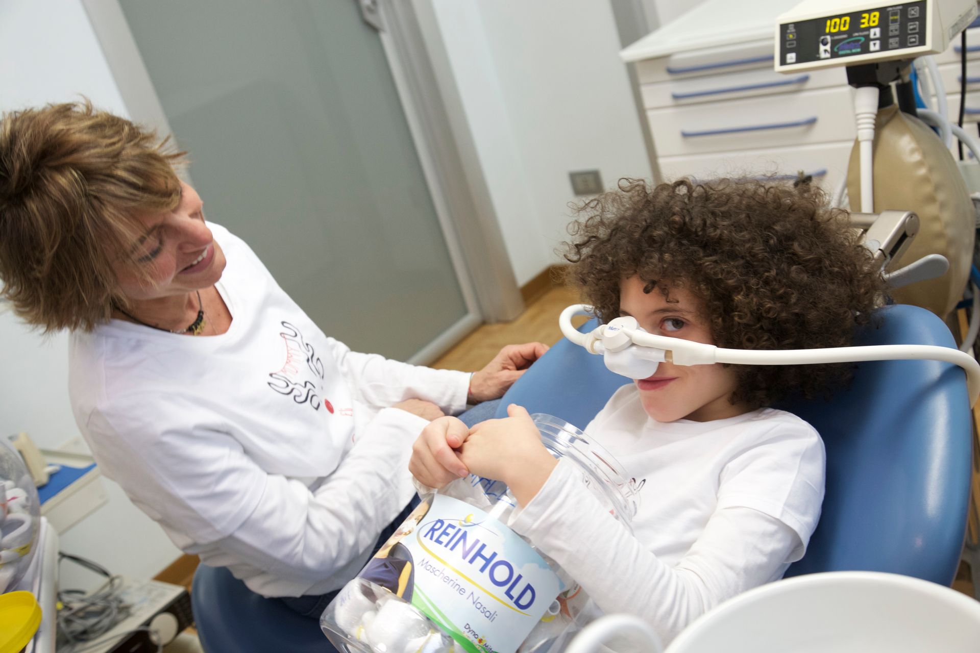 Utilizziamo da anni l’ analgesia sedativa come metodo di rilassamento per adulti e bambini. Si tratta di una metodica utilizzata da decenni negli USA, ma ancora poco conosciuta in Italia. Mediante una apparecchiatura dedicata (sedation machine) viene erogato un quantitativo controllato di protossido d’azoto e ossigeno. Tale miscela, inspirata con il naso mediante una mascherina dedicata, produce nel paziente una profonda sensazione di rilassamento, senza procurare alcun accumulo nell’organismo. Infatti, alla dismissione della respirazione dei gas, il paziente è perfettamente cosciente e in grado di svolgere qualunque attività. Il nostro scopo è quello di rendere le terapie odontoiatriche il più indolore possibile e consentire le cure anche a coloro i quali, per precedenti trattamenti traumatizzanti, hanno evitato, negli ultimi anni, di recarsi dal dentista.