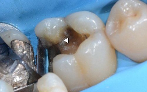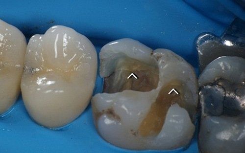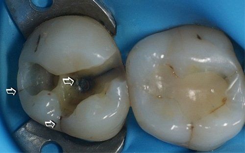 Upon removal of the old restoration, the diagnosis will be confirmed by visualising fracture lines that may involve various areas of the tooth (usually the base of one or more cusps, extending to the entire roof of the pulp chamber and root extension). Not all cracks are equally severe: we believe that preserving the vitality of the pulp, where possible, along with protecting the affected cusps from cracking, is the most conservative and long-term effective therapy for tooth health. In the "Direct restorative dentistry" section and especially in the "Indirect restorative dentistry" section, you will find a series of restorative solutions for the cracked tooth.