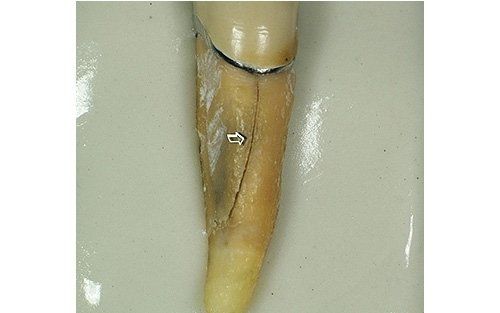 Vertical root fracture, on the other hand, is one of the few conditions that leave no doubt about treatment: once diagnosed, extraction is the only possible treatment. This type of fracture should not be confused with other types of root fractures, such as post-traumatic ones, which, on the contrary, have a high success rate. Vertical fracture, however, is a fracture line, often starting from a coronal fissure (as described above), creating a continuity solution between the intra- and extra-radicular environments, that is, communication between these two environments, creating the conditions for an infection.